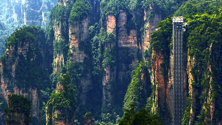 Лифт Байлун, или «Сто Драконов», — стеклянный двухуровневый открытый лифт, встроенный в скалу над лесным парком Улинъюань. Он поднимается более чем на 300 метров за несколько минут, что позволяет добраться до обзорных площадок без длительного подъёма пешком. Лифт вписан в Книгу рекордов Гиннеса как самый высокий наружный лифт в мире.