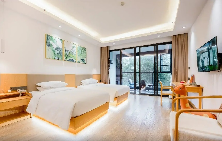 Отель расположен в районе Miaoxi (Wuxing District) города Хучжоу, в окружении бамбуковых лесов и природных ландшафтов. Комплекс находится на территории тематического парка Huzhou Giraffe Manor, рядом с такими локациями, как Miaoshan Village, Huixin Valley · San Gui Tea Pavilion и живописными маршрутами для прогулок и хайкинга.
