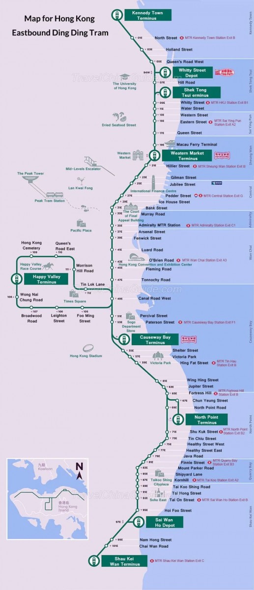 Вдоль самой популярной, северной части, острова Гонконга протянулась трамвайная линия с шестью маршрутами и главными конечными пунктами Kennedy Town на западе и Shau Key Wan на востоке. Благодаря скорости, доступности и частоте трамвай является одним из самых удобных и дешевых способов исследовать Гонконг самостоятельно с минимальными усилиями.