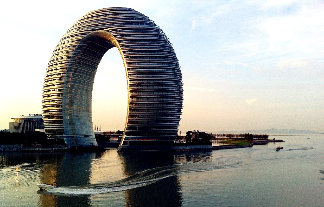 Sheraton Huzhou Hot Spring Resort — уникальный архитектурный объект, открытый в 2012 году. Здание выполнено в форме кольца и расположено прямо над водой озера Тайху. Отель быстро стал символом современного Хучжоу и получил международное признание за дизайн. Его высота составляет около 100 метров.